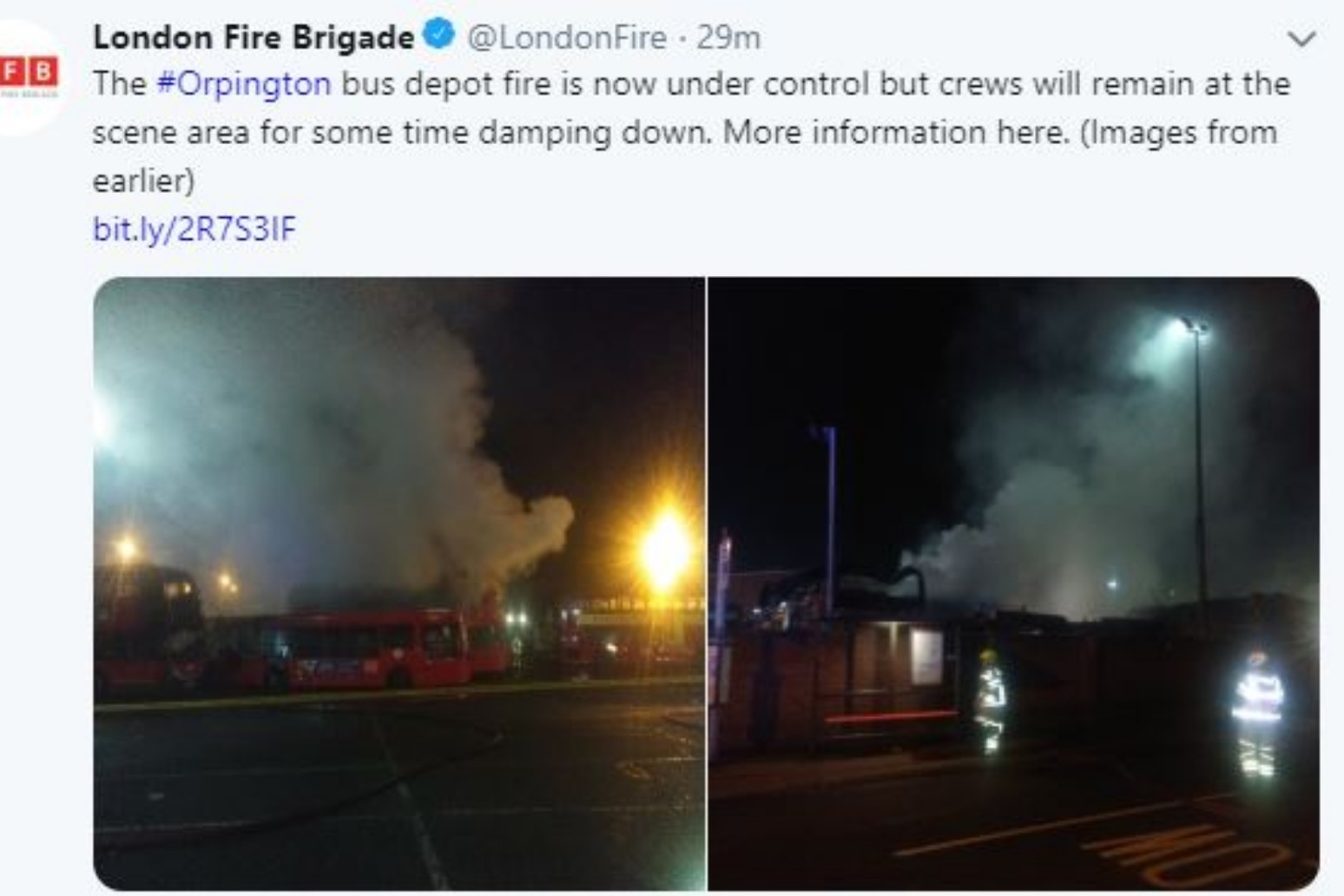 Eight fire engines are at the depot on Farnborough Hill, Orpington, the fire brigade said in a statement https://www.london-fire.gov.uk/incidents/2018/november/bus-depot-fire-orpington.