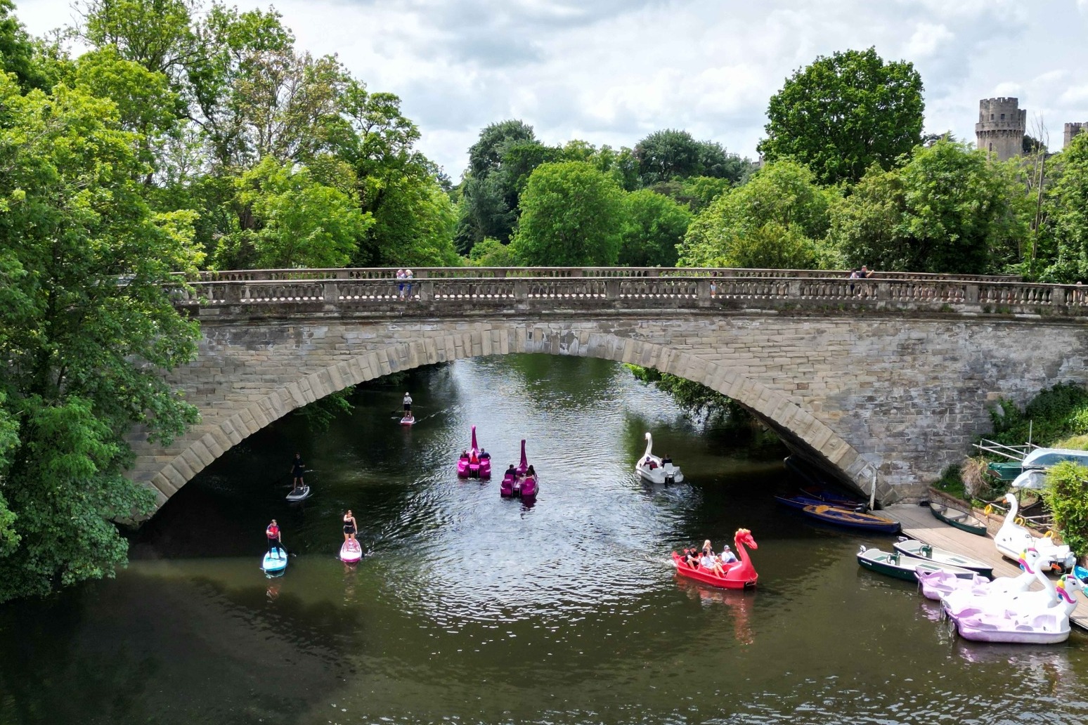 Pictures show people taking to the outdoors in the hot weather to sunbathe, paddle board and wake board among other activities.