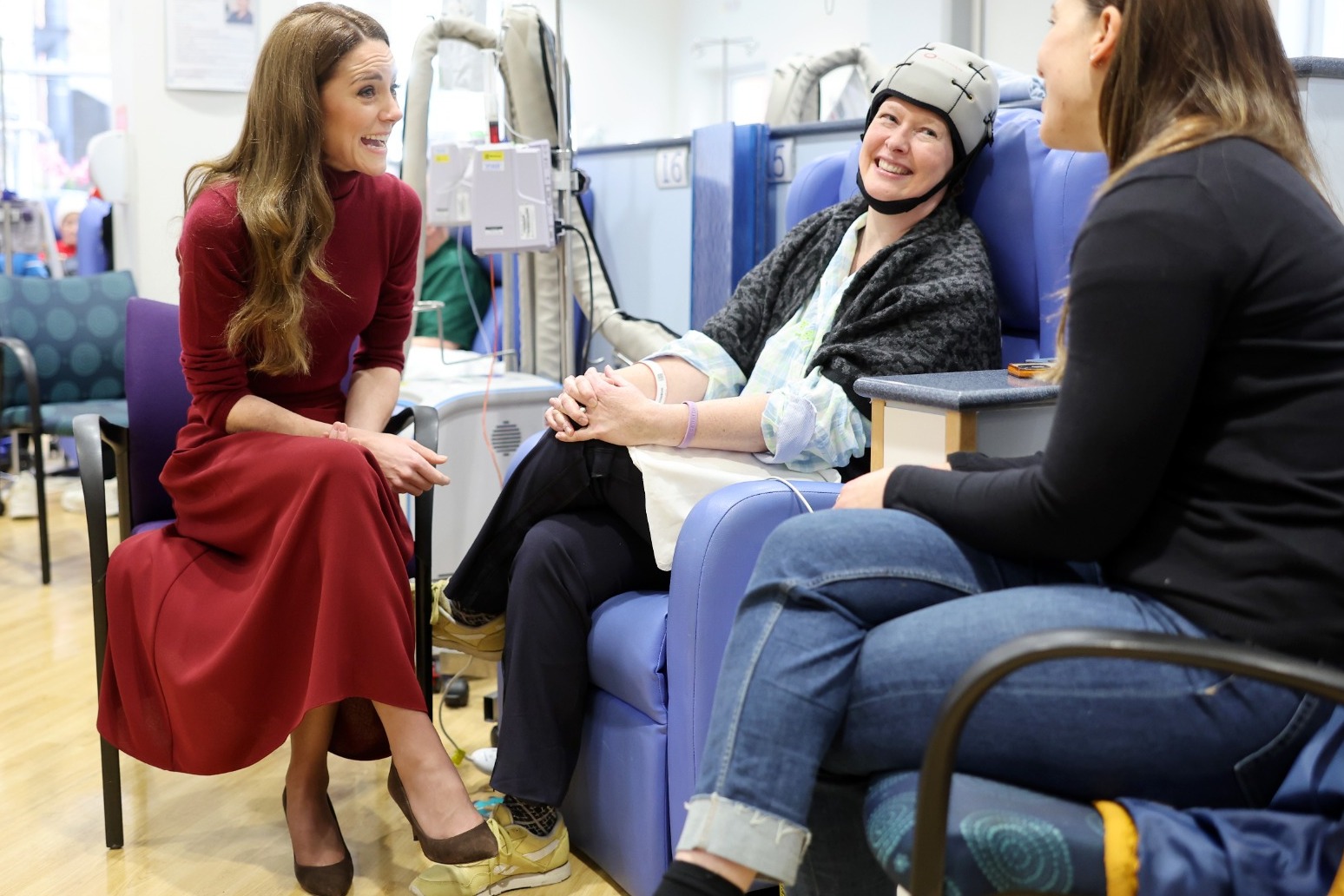 Kate, dressed in a long dark brown tartan coat and burgundy polo neck and skirt, said as she arrived at the hospital’s main entrance: “I was just saying, coming in the front entrance here, having made so many quiet, private visits, actually it’s quite nice.”