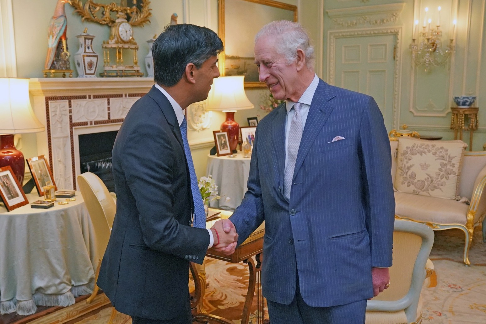 Charles, wearing a suit and tie, was seen shaking hands warmly with Mr Sunak, and greeting him with a broad smile.