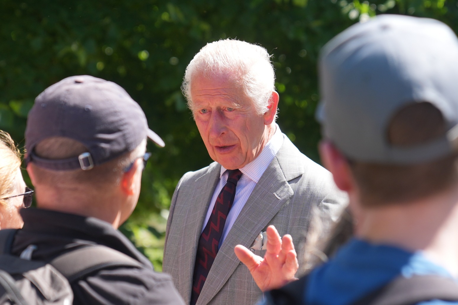The King – who is continuing to receive treatment following a cancer diagnosis – wore a grey suit, purple tie and brown shoes.