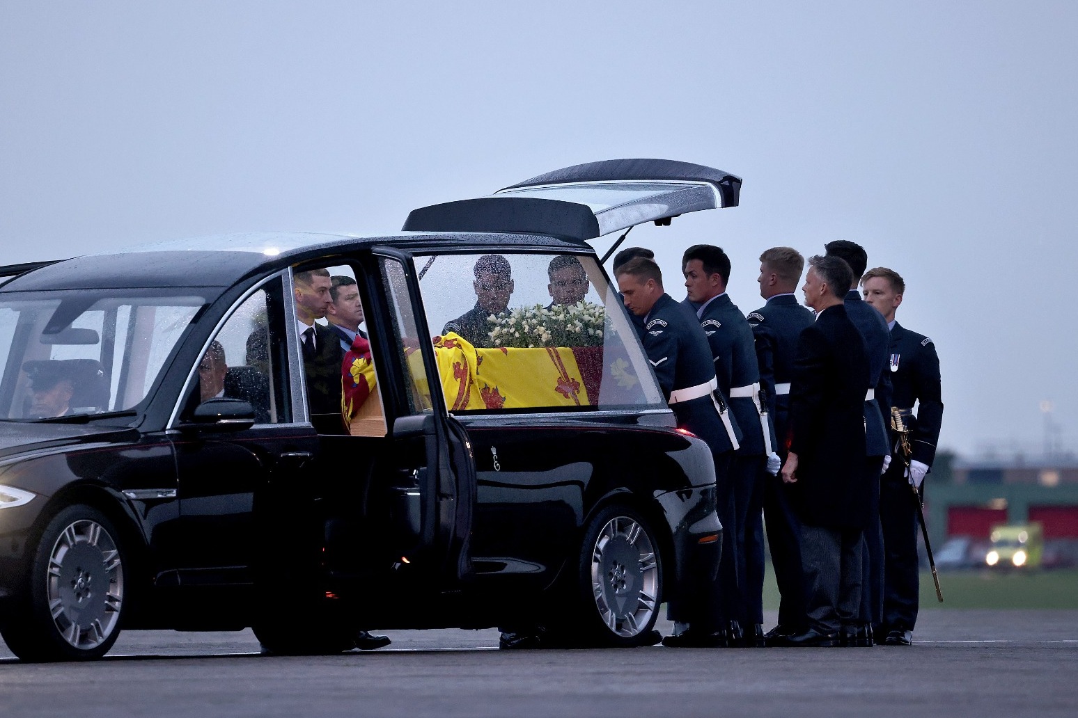 Before the coffin was carried by a bearer party to a waiting state hearse, the Princess Royal and her husband left the military plane and stood with Chief of the Air Staff Sir Mike Wigston, while nearby was the Prime Minister Liz Truss and Defence Secretary Ben Wallace.