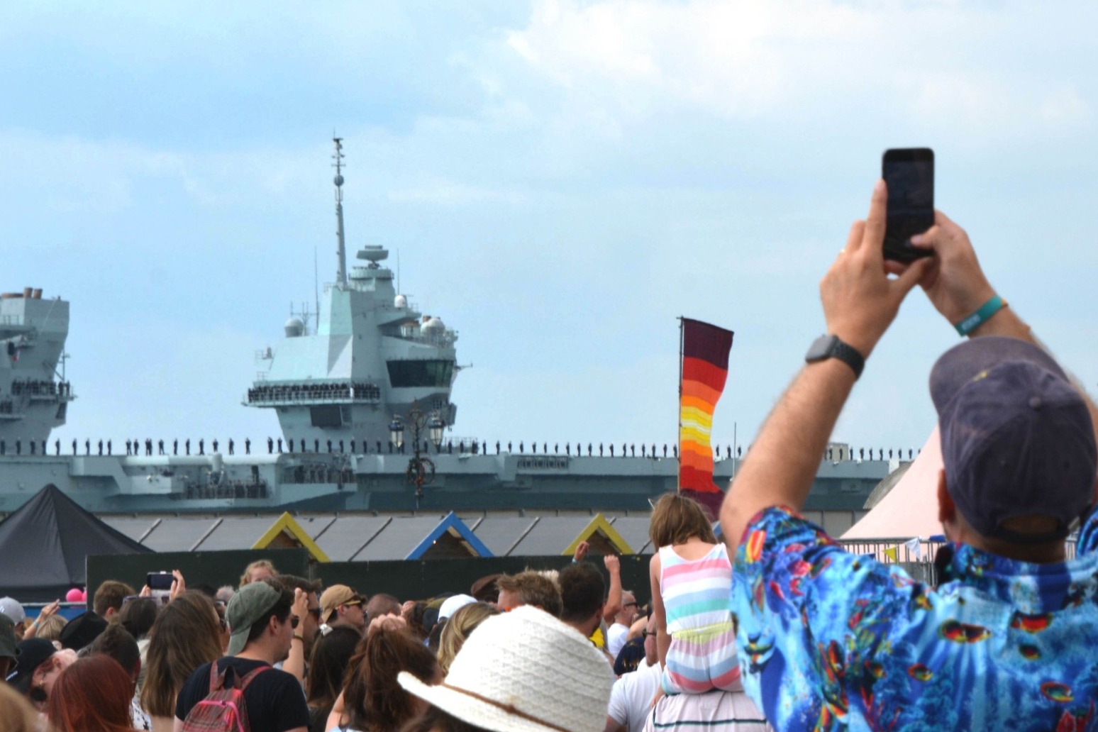 On Saturday afternoon, the crowds were treated to a view of the 65,000 tonne Royal Navy aircraft carrier HMS Prince of Wales sailing past as it left Portsmouth Naval Base for exercises off the USA.