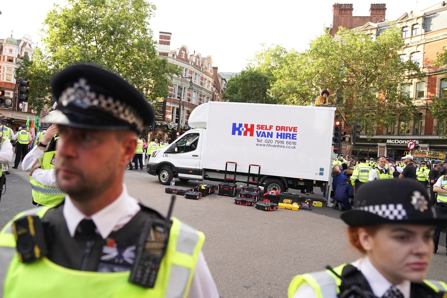 An elderly woman who lay in the road was carried off by four policemen and appeared to be arrested, with XR protesters suggesting this was for obstruction.