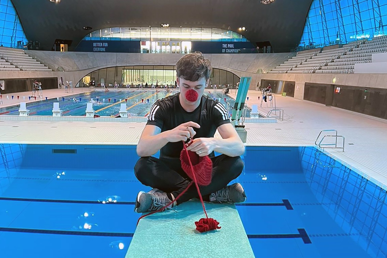 Tom Daley has been seen knitting red noses on the end of a diving board ahead of his Red Nose Day challenge, where he will be tackling a four-day journey from London to Plymouth by foot, water, boat and bike.